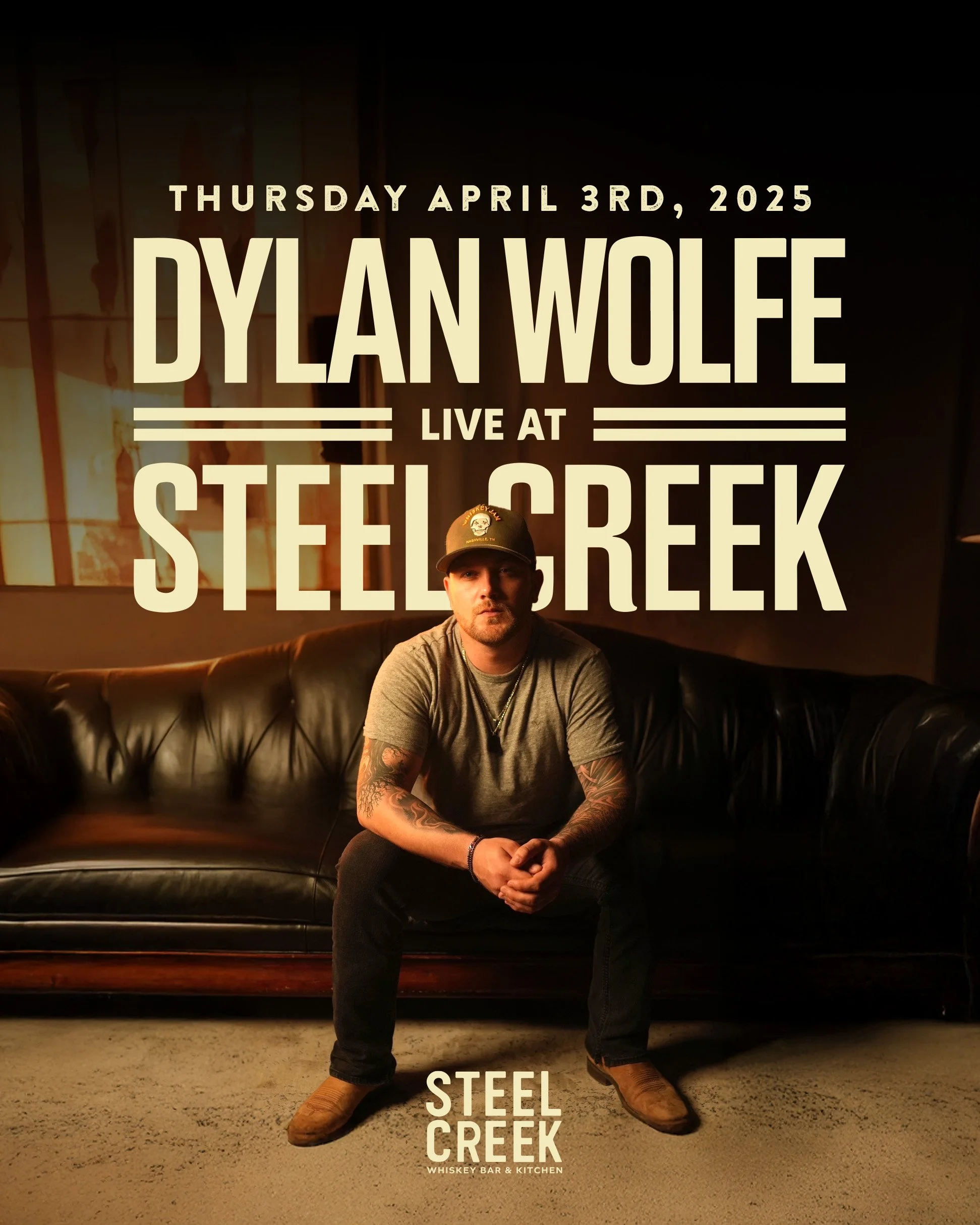 Steel Creek is bringing Dylan Wolfe to the stage on Thursday, April 3rd, for a night of country-rock energy you don’t want to miss!