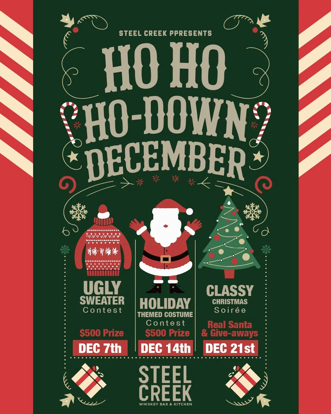 The holiday fun doesn’t stop at Steel Creek—this December, we’re turning up the festive cheer with THREE epic weekends of Ho Ho Hoedowns!