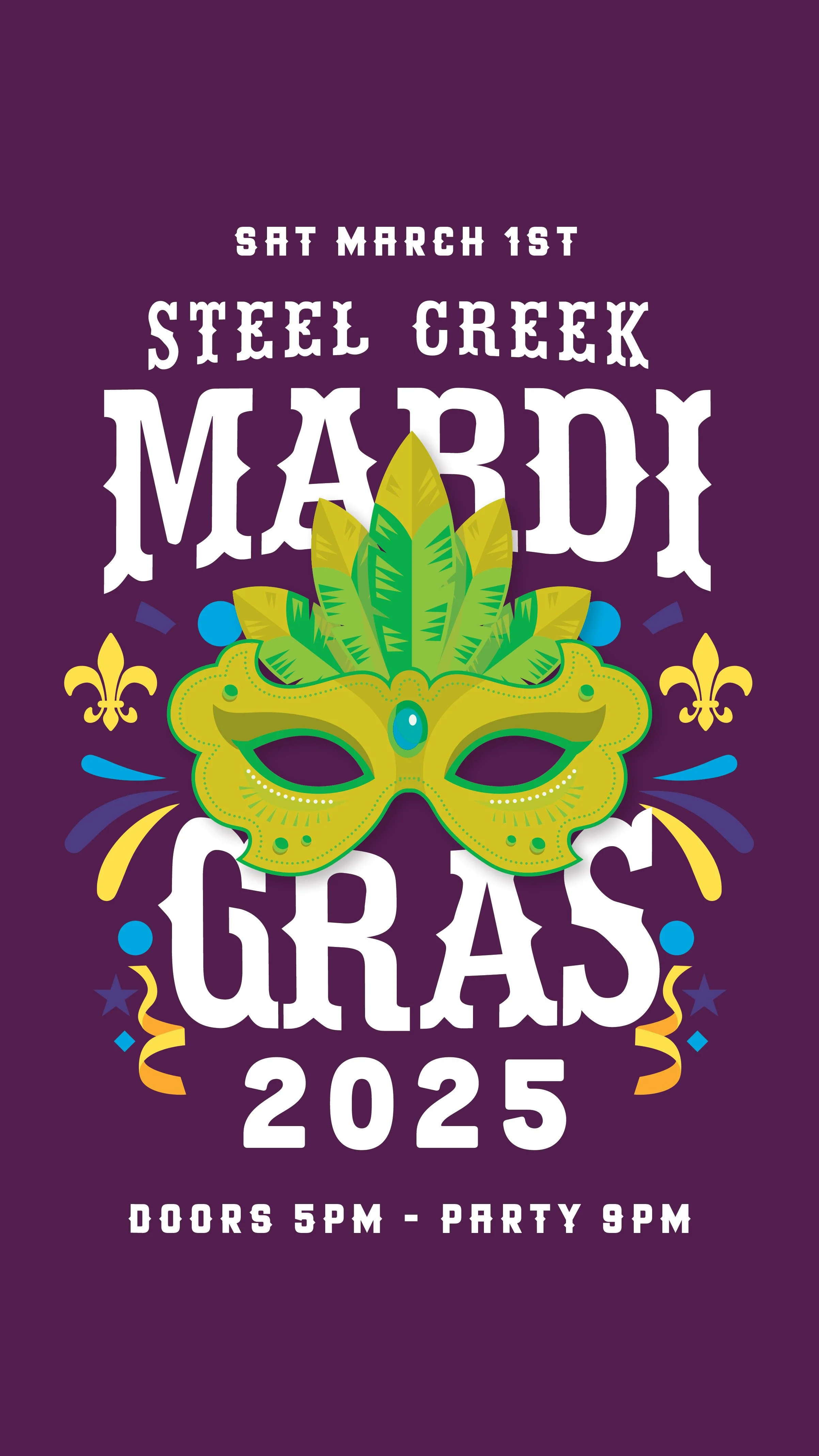 MARDI GRAS ENERGY, STEEL CREEK STYLE! We’re taking the classic Steel Creek party vibe and kicking it up a notch with high-energy celebrations that’ll have you feeling like you’re in the French Quarter!
